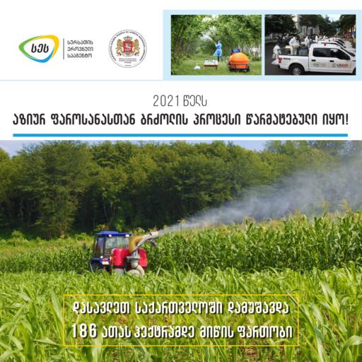 2021 წელს აზიურ ფაროსანასთან ბრძოლის პროცესი წარმატებული იყო. ▶ სურსათის ეროვნული სააგენტოს ფაროსანასთან ბრძოლის საკოორდინაციო მართვის ცენტრმა მავნებლის საწინააღმდეგო ღონისძიებების აქტიური ეტაპი დაასრულა. ფაროსანასთან ბრძოლის მიზნით, დასავლეთ საქართველოში მობილიზებული იყო 250-მდე სპეციალიზებული ტექნიკა. 🎙 სურსათის ეროვნული სააგენტოს უფროსის მოადგილის, ზურაბ ლიპარტიას განცხადებით, მავნებელთან ბრძოლის ღონისძიებები, სახელმწიფო პროგრამით დადგენილი გეგმის მიხედვით, წარმატებით განხორციელდა, რის შედეგადაც ფაროსანას მიერ სასოფლო-სამეურნეო კულტურების დაზიანება მინიმუმამდე შემცირდა და ფერმერებმა წელსაც თხილის, სიმინდისა და ციტრუსის კარგი მოსავალი მიიღეს. 📍 სამეგრელოს, გურიის, იმერეთის რაჭა-ლეჩხუმისა და აჭარის 33 მუნიციპალიტეტში დამუშავებულია 186 000 ჰექტრამდე ფართობი (თერმული ნისლის ტექნოლოგიით - 113 500 ჰა, სიმინდის მასივი - 34 700 ჰა, სოფლისა და ტყის პერიმეტრი - 37 800 ჰა). 🌳 გარემოზე პესტიციდების დატვირთვის შემცირების მიზნითა და წინა წლების გამოცდილების გათვალისწინებით, მიმდინარე წელ